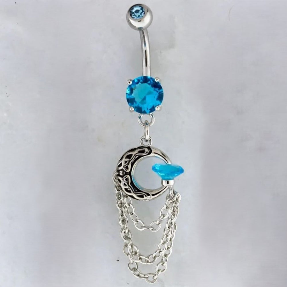 Novelty navel jewelry is not intended for initial piercings and should only be used in healed piercings as it should not be sterilized with harsh chemicals. Shaft and top ball are made with 316L steel. The bottom gem setting and dangle are cast from lead and nickel free brass or zinc and then plated with either 24k gold, rhodium, 14K rose gold, and/or epoxy paint. All plating materials are lead, cadmium and nickel free.