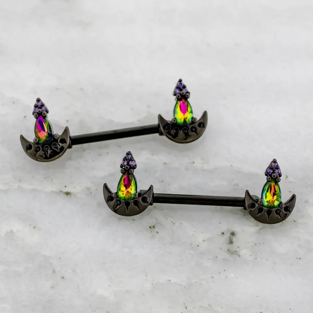 Nipple Ring Dark Rainbow Gem and Crescent Moon