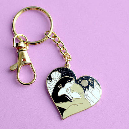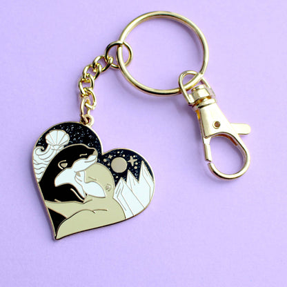Express your love of all things otter with this in-love pair! This 35mm gold hard enamel keychain features two hugging otters, with mountains and the sea in the background and a black glitter sky.